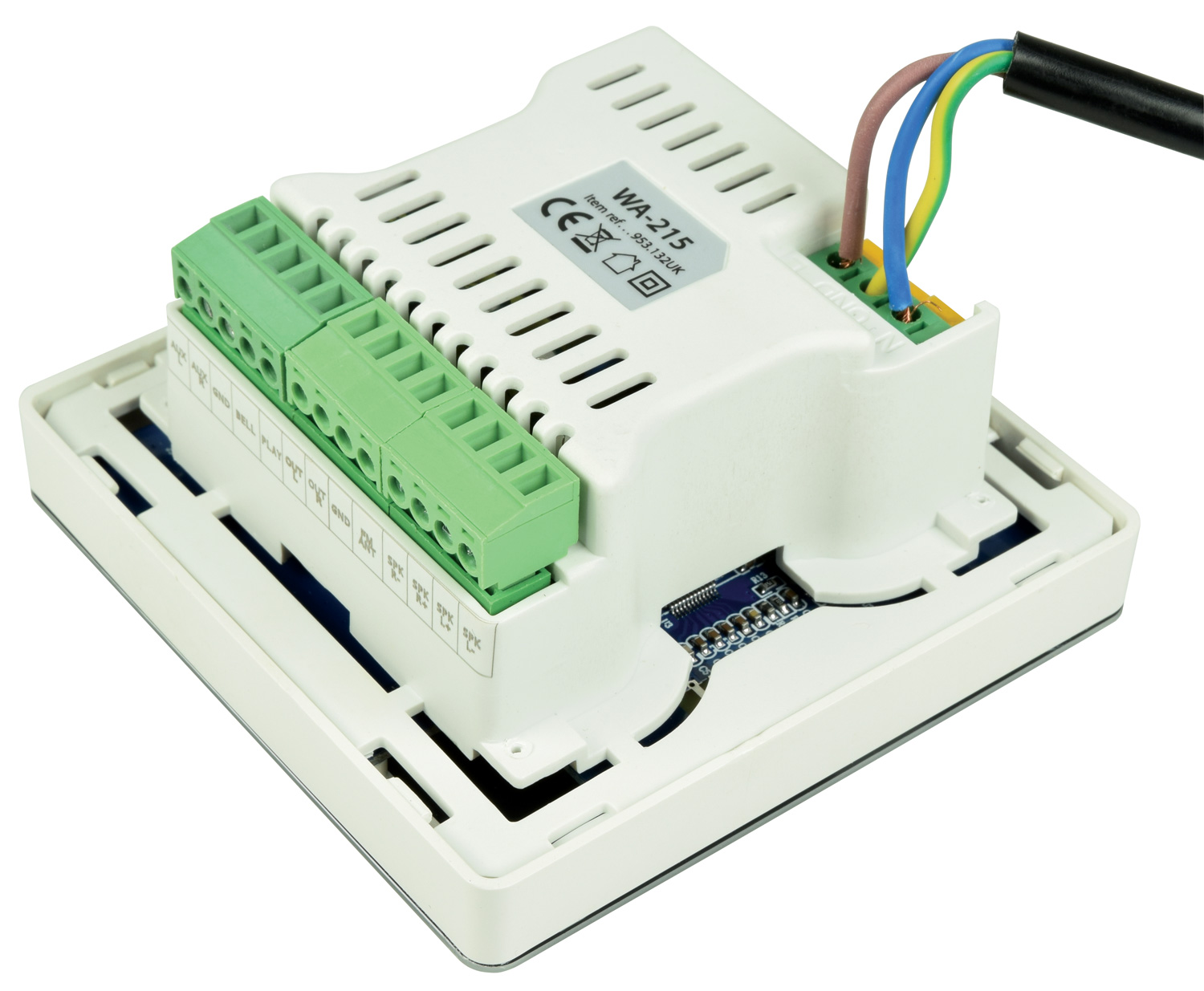 Compact audio controller with 2 x 15W digital amplifier built into a single gang wall plate. Powered directly from 100-240Vac mains supply, the unit can be installed into a partition wall or 47mm back box and provides a minimal yet fully functional control surface. The WA-215 has an inbuilt USB/MicroSD audio player, an FM tuner and Bluetooth receiver. Key functions are operated from the front touch panel or by using the supplied IR remote control. Connections for 2 speakers, mains power, FM antenna and an external line input are provided at the rear on screw terminal Euroblock connectors. Trigger contacts are also included for media playback and in internal doorbell sound. A complete and versatile audio solution for wall or ceiling background music speakers in the home or commercial premises.