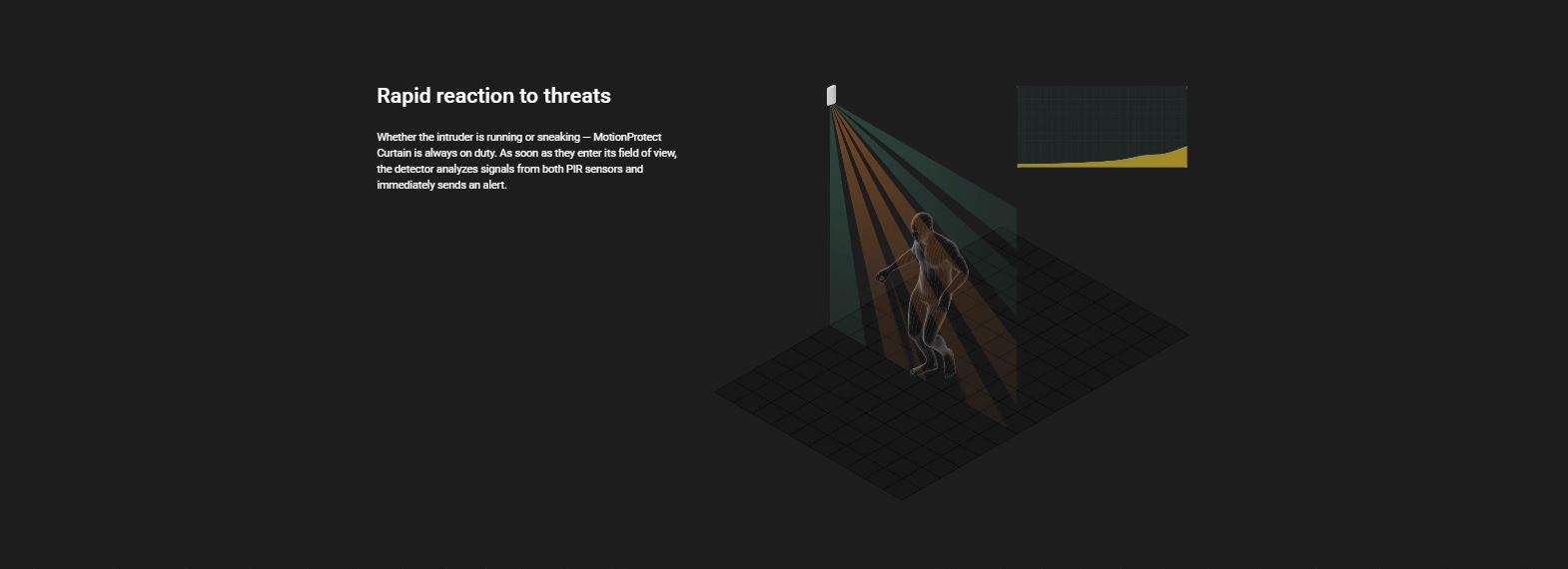 Whether the intruder is running or sneaking — MotionProtect Curtain is always on duty. As soon as they enter its field of view, the detector analyzes signals from both PIR sensors and immediately sends an alert