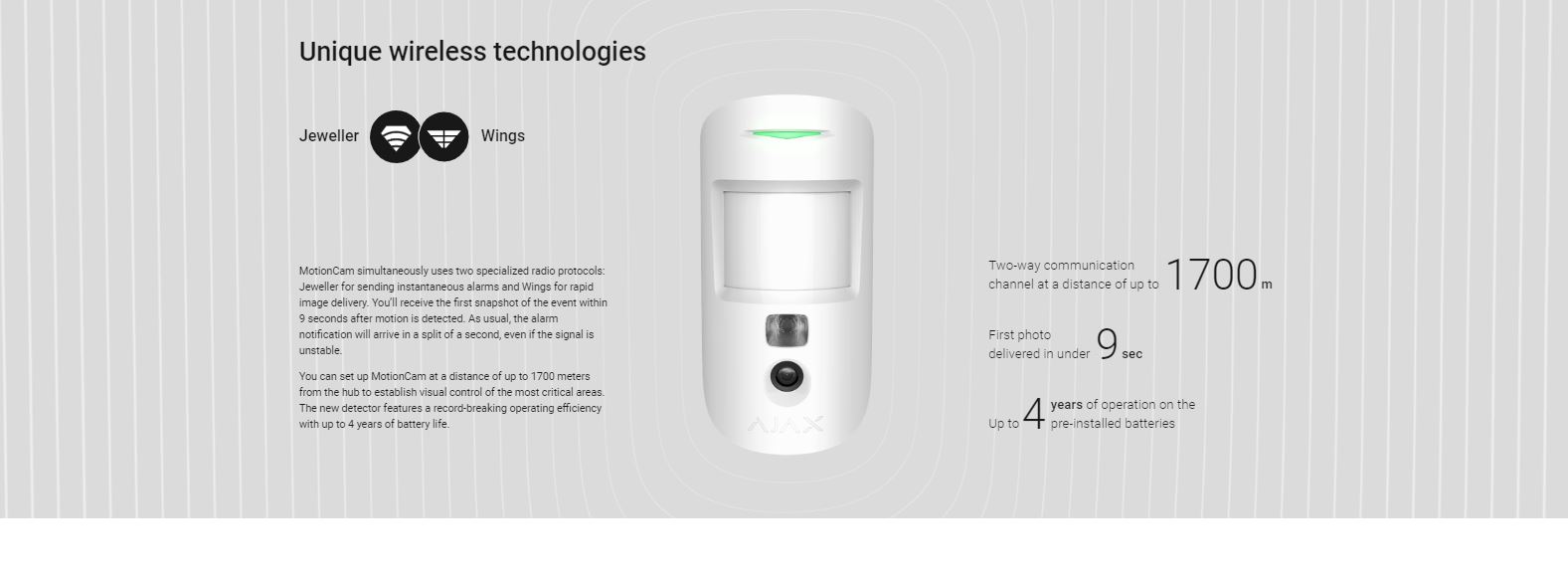 MotionCam simultaneously uses two specialized radio protocols: Jeweller for sending instantaneous alarms and Wings for rapid image delivery. You’ll receive the first snapshot of the event within 9 seconds after motion is detected. As usual, the alarm notification will arrive in a split of a second, even if the signal is unstable