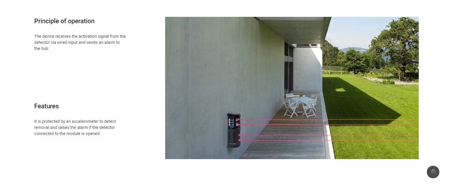 The device receives the activation signal from the detector via wired input and sends an alarm to the hub