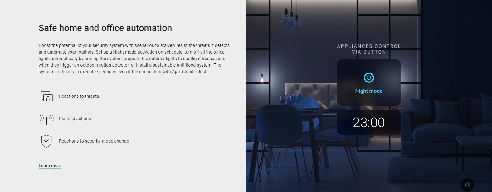 Boost the potential of your security system with scenarios to actively resist the threats it detects and automate your routines. Set up a Night mode activation on schedule; turn off all the office lights automatically by arming the system; program the outdoor lights to spotlight trespassers when they trigger an outdoor motion detector; or install a sustainable anti-flood system. The system continues to execute scenarios even if the connection with Ajax Cloud is lost