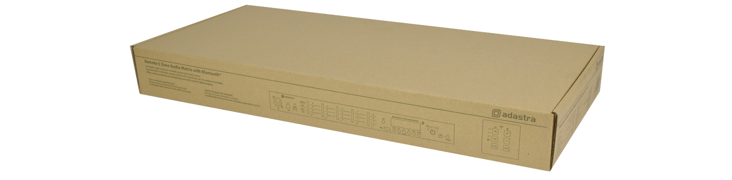 1U rack-mountable audio matrix with 4 selectable inputs to 5 output zones. An inbuilt media player section features playback from USB media, 3.5mm aux input or Bluetooth. A TR86 touch operated remote wall plate is included to control source and output level for one of the zones. Additional TR86 wall plates may be added up to the full 5 zones as required. Outputs to zones can be monitored via an assignable 3.5mm stereo headphone output. For global alerts and announcements, a front and rear XLR input is provided for a microphone, operated via a paging button that overrides the selected or local audio source for all zones. The RZ45 forms the command centre for installations ranging from basic remote control to a fully specified multi-room audio matrix.