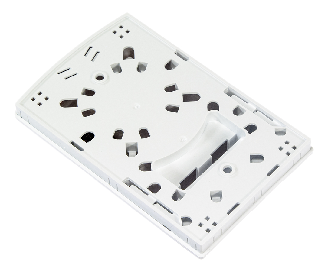 Custom made fiber optic termination box. It has a place to hide a spare cable and two holes adapted for mounting adapters. Used as the end of the FTTH fiber that is led to the customer. On the front there is a retractable panel under which you can hide the adapters and the end of the fiber optic cable.