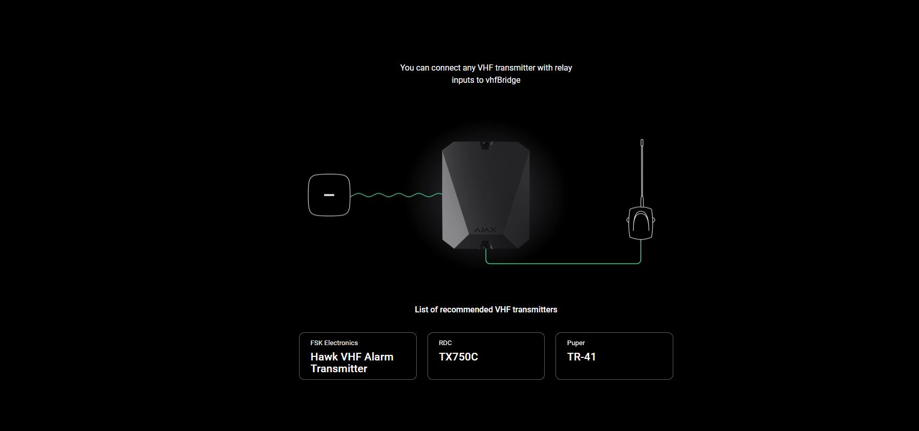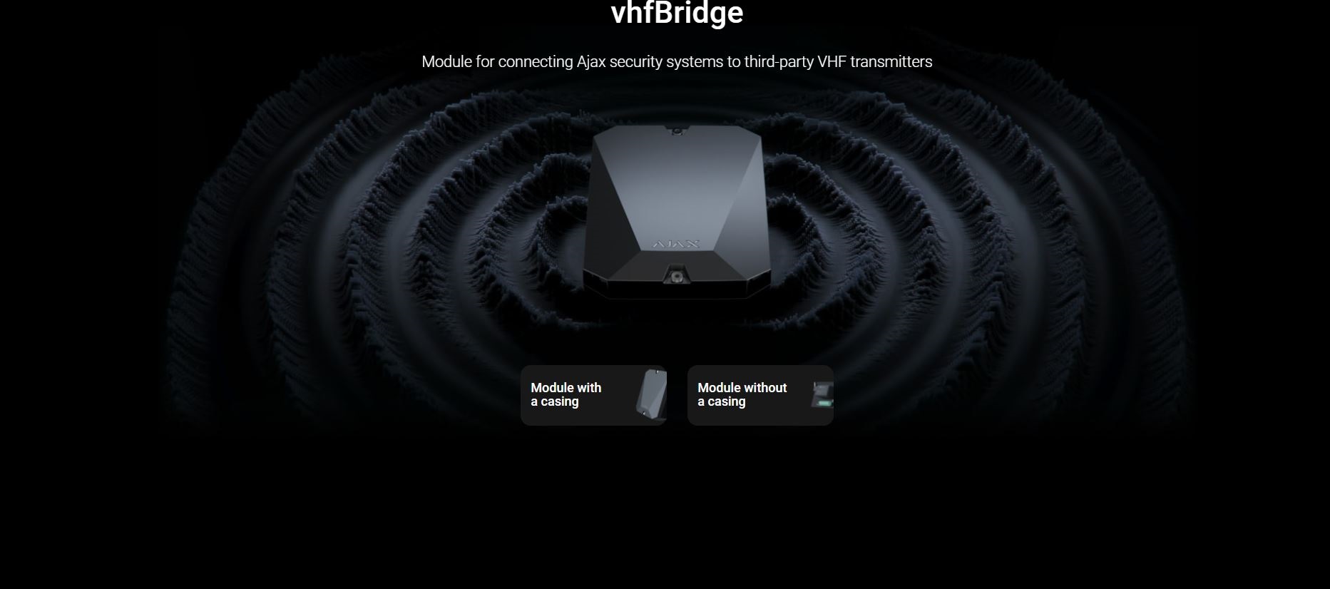 - Similar to other Ajax devices, vhfBridge connects to a hub in the app by scanning a QR-code. The transponder casing has perforated areas for more organized wiring. Outputs are configurable with Ajax apps for smartphones and computers