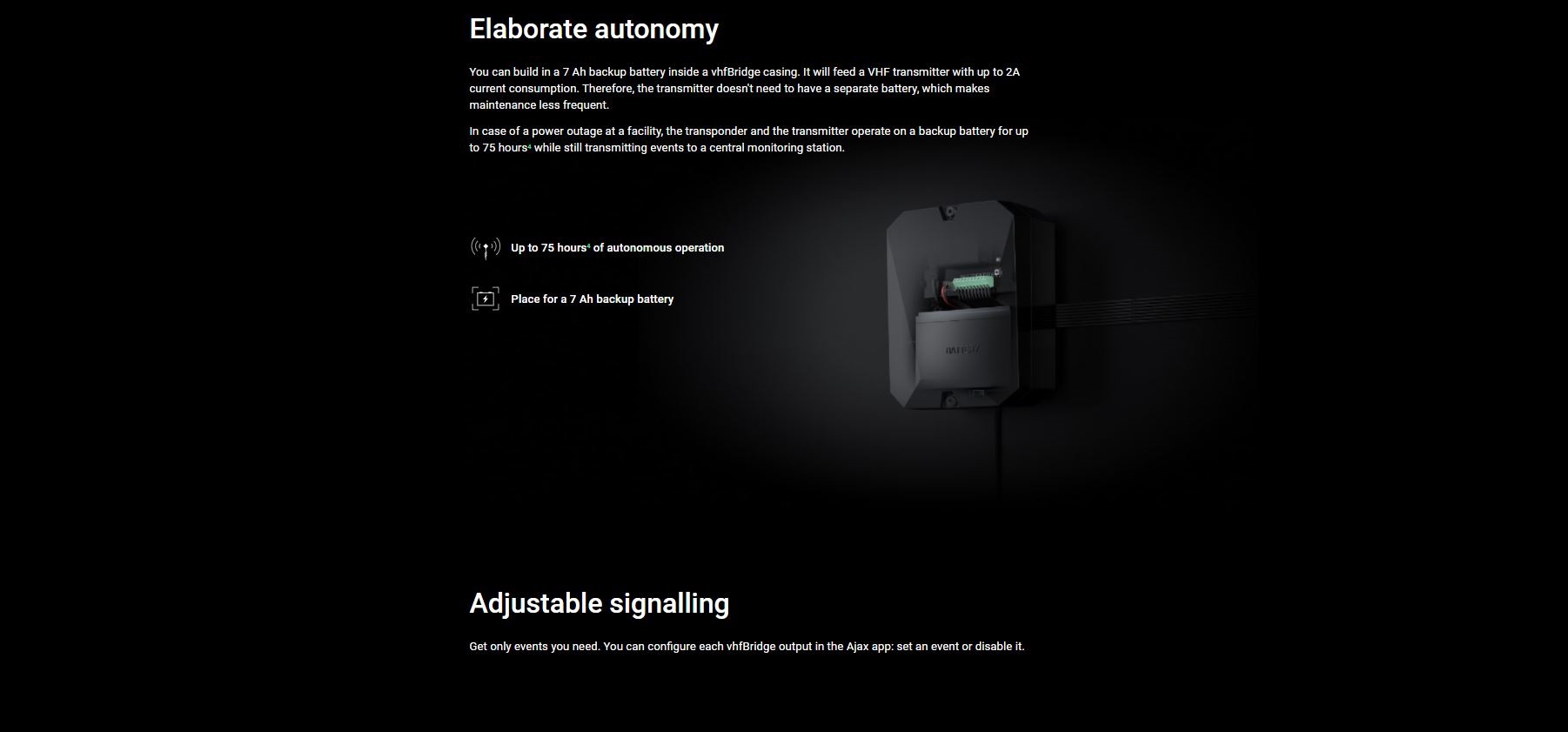 - You can build in a 7 Ah backup battery inside a vhfBridge casing. It will feed a VHF transmitter with up to 2A current consumption. Therefore, the transmitter doesn't need to have a separate battery, which makes maintenance less frequent