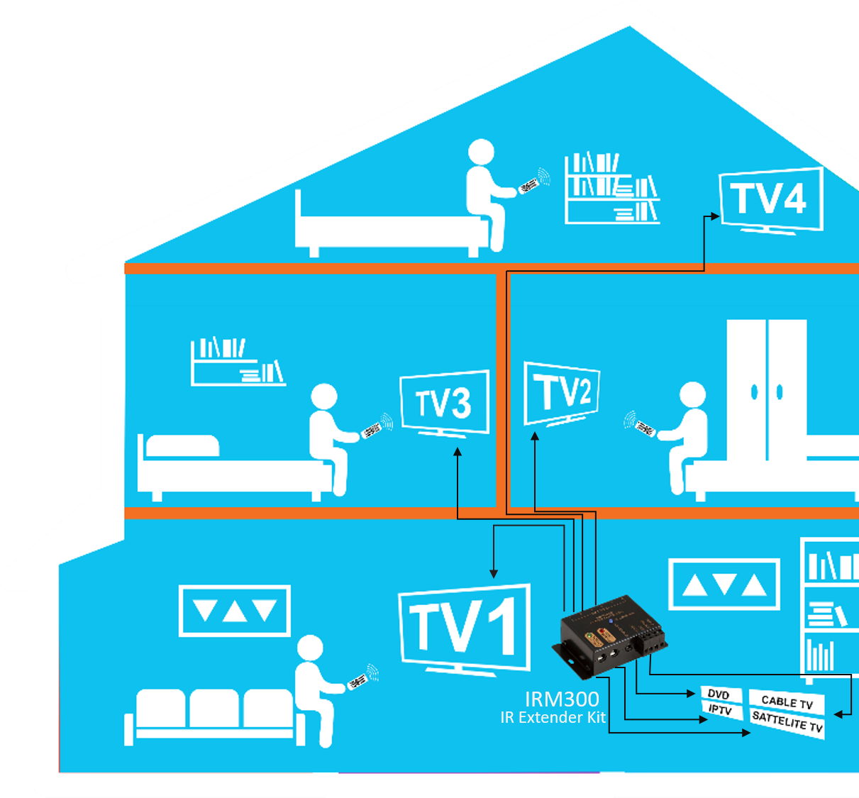 IR Extender KIT with 4 inputs for A/V equipment and 4 extra room outputs