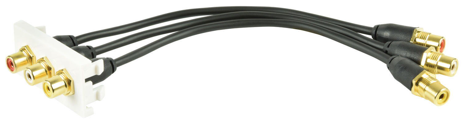 50mm x 25mm clip in module with RCA stereo audio and Composite video jack connections and female tails to the rear. Ideal for simple connection of audio and video equipment such as TV's DVD's and HiFi's in a different location without the need for trailing wires. Suitable for domestic, commercial or educational applications.