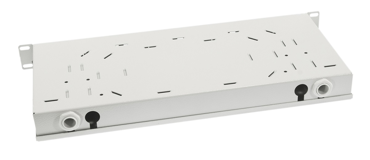 Opton fiber optic distribution box adapted to be mounted in a 19 "rack. The height is 1U, the product is made of 1 mm thick steel sheet covered with Magnelis coating, the back has two empty holes and two secured by glands. Inside there are numerous ribs that allow you to fasten the cables with clamping bands.The centrally placed screw is used to mount the welding tray.The front panel allows you to mount 24 SC Simplex or LC Duplex adapters.