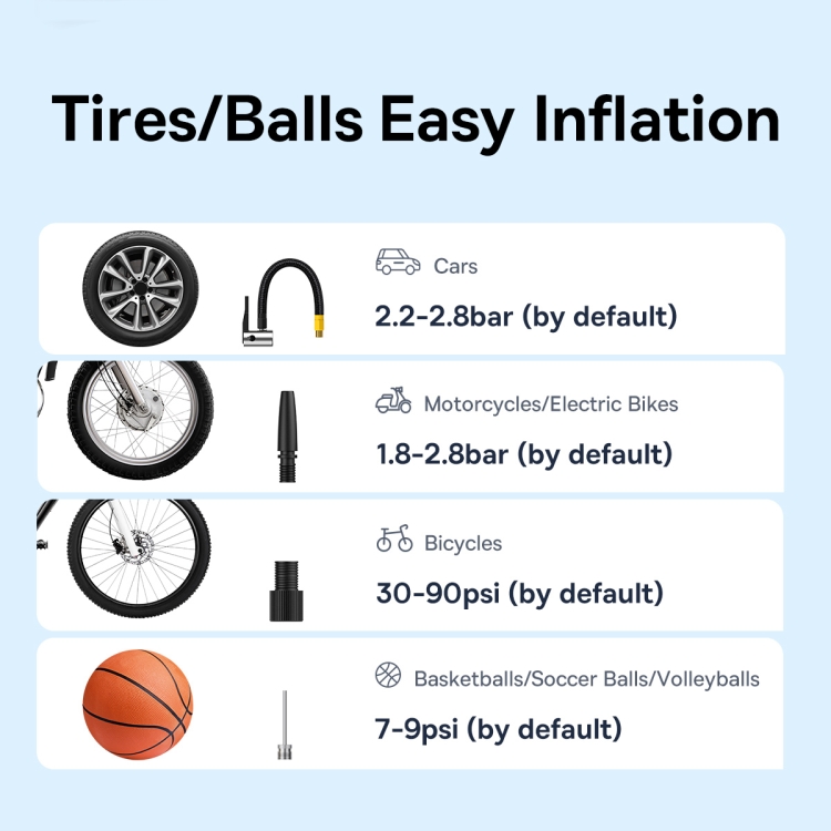 • Applicable to: Cars/Motorcycle/Bicycles/Basketballs, etc.