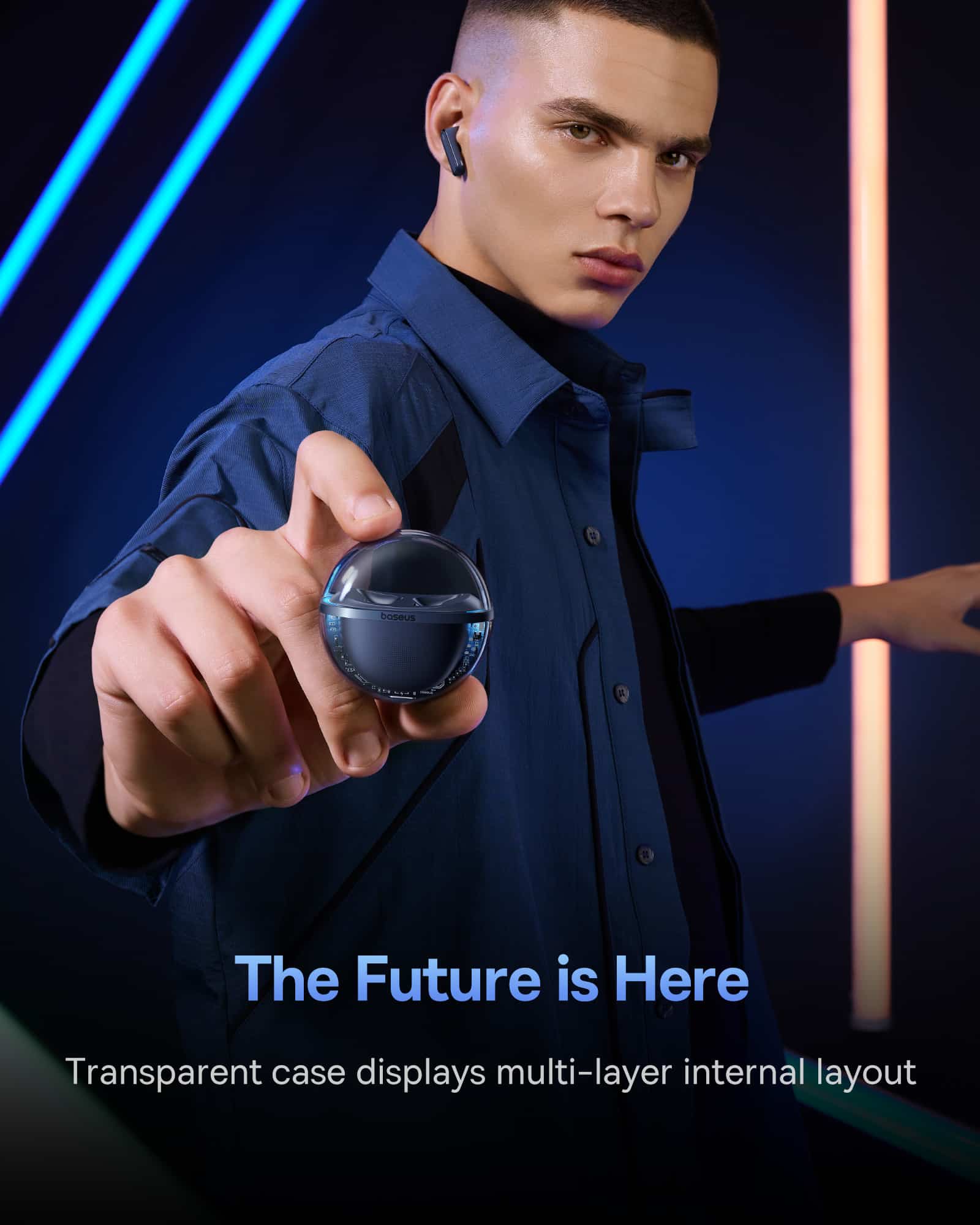TWS Baseus Bowie E5x are wireless in-ear headphones with an unusual design that makes them look like they levitate. With their blue accents and transparent elements, the headphones have an unusual character.