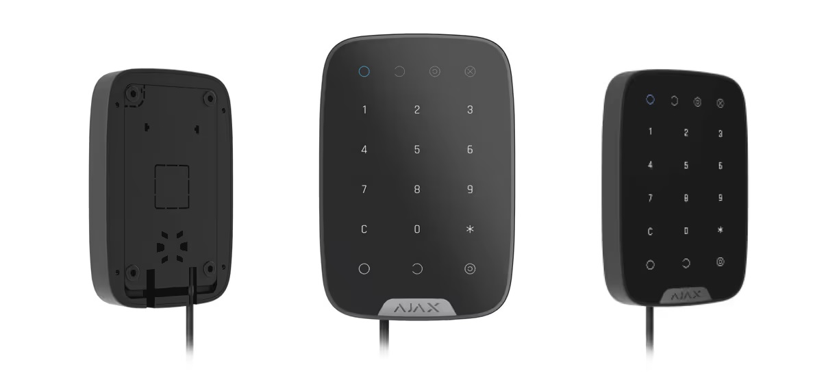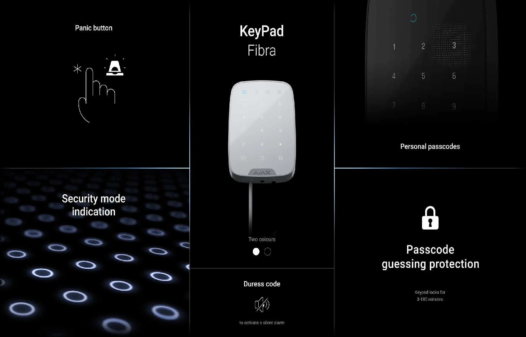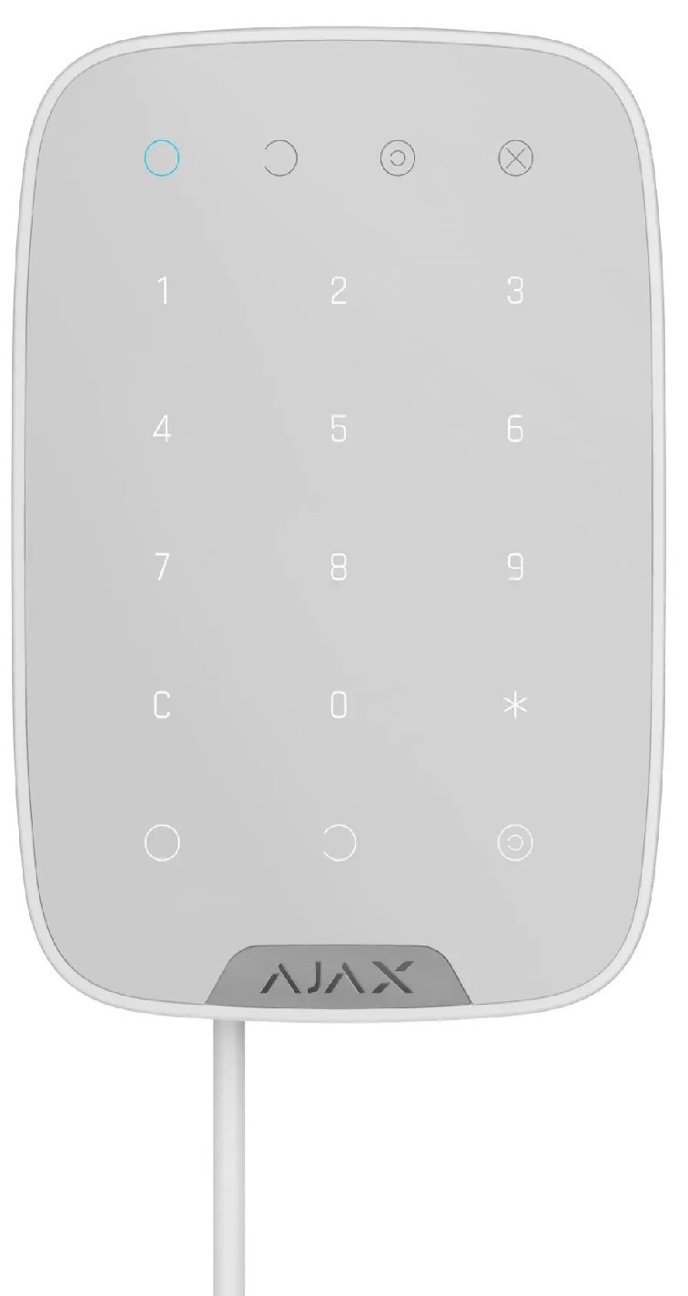 - KeyPad Fibra is a wired touch keypad of the Ajax security system. Controls the security modes and Night mode. Supports duress code and protected from access code guessing. When it is active, the LED indication notifies about the security mode