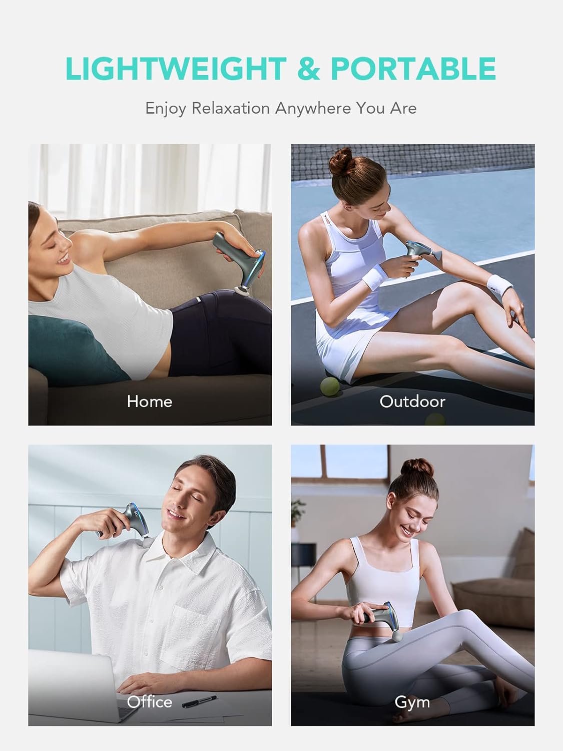USER FRIENDLY DESIGH FOR ZERO BURDENS: This massager gun is designed with a color indication system, which shows the massage or heating mode; The roller variator helps you easily adjust the percussion level and temperature; The ergonomic and lightweight( EVEN LESS THAN 1LBS) design give you a great portable and using experience.