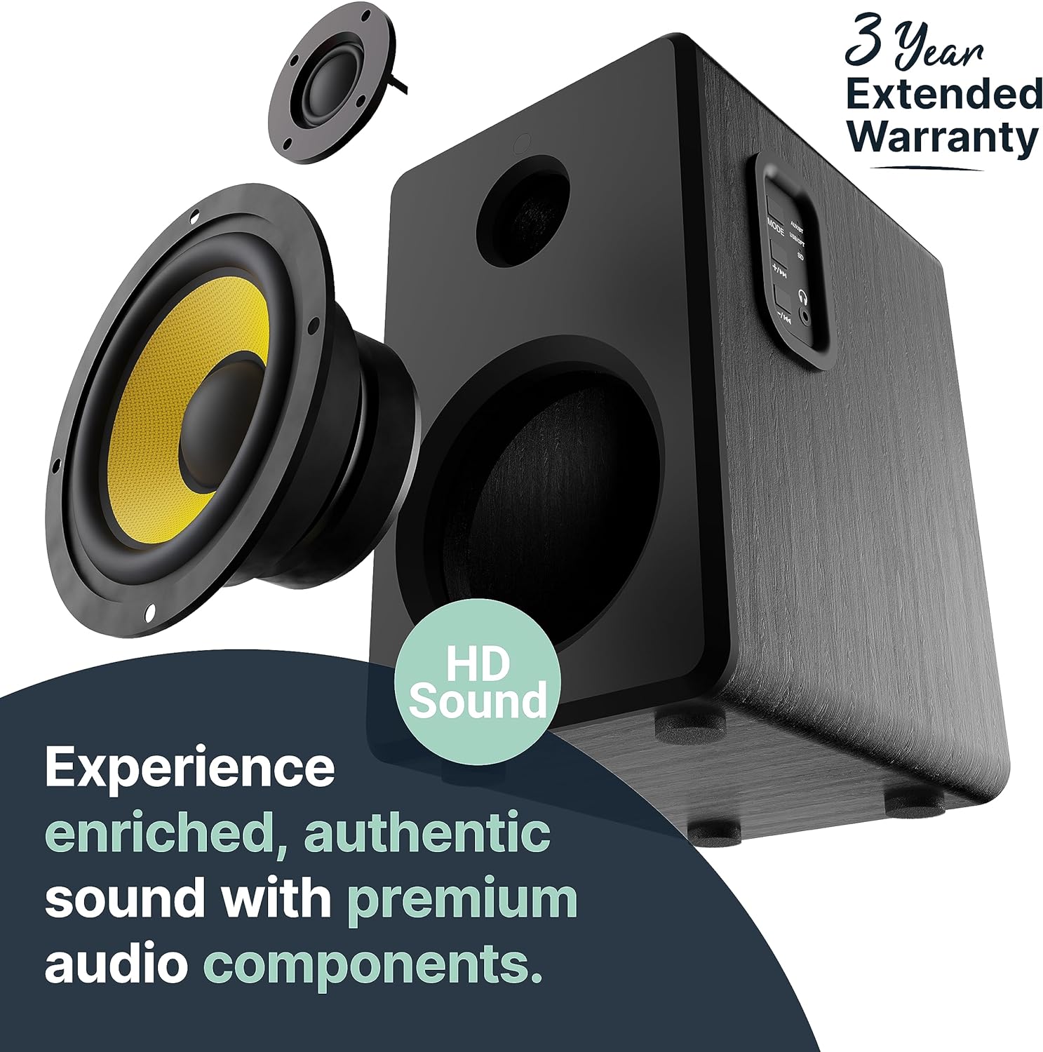 TV, PC, OPTICAL, RCA, USB, SD, AUX: Its size ensures easy placement as book shelf speakers without taking up much space. Connectivity made simple with a wide range of options, including Aux, Optical/RCA, USB, & SD cards.