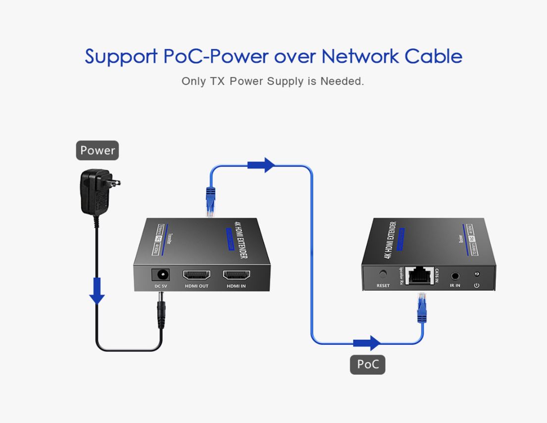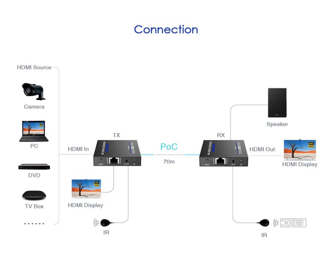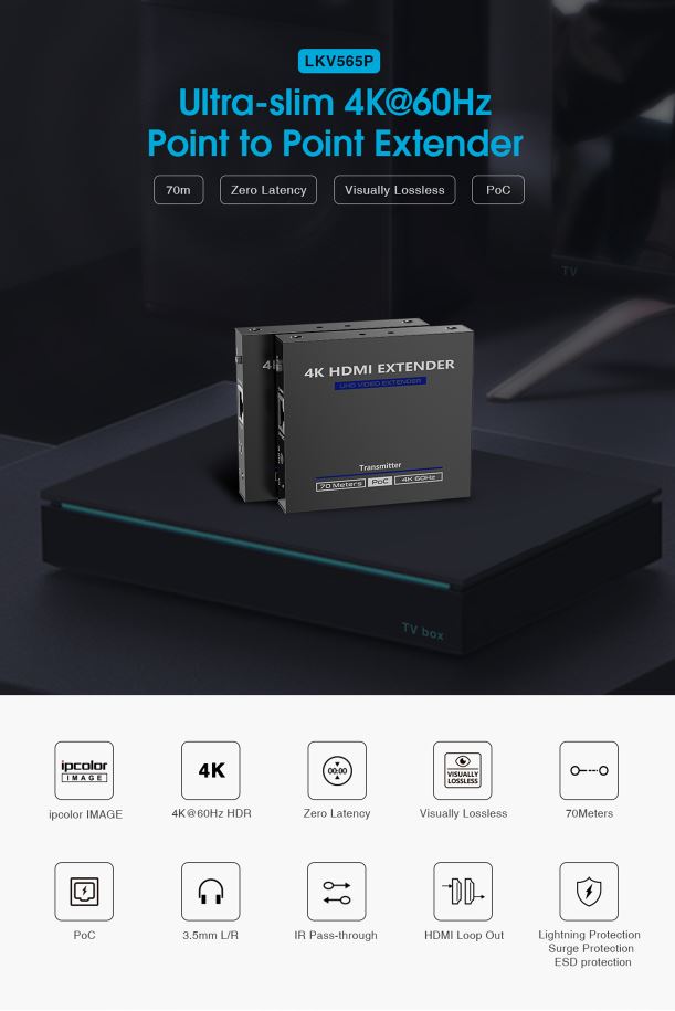 This is an HDMI point-to-point extender kit, it can realize zero-latency transmission. The 4K@60Hz HDMI™ signal can be extended by 70m through CAT6/6A/7 network cable. It supports HDMI loop out, IR passthrough, 3.5mm audio output, etc. This kit is a reliable, ultra-high-definition video transmission solution, which is widely used in security monitoring, home theater, broadcasting, training and other fields.