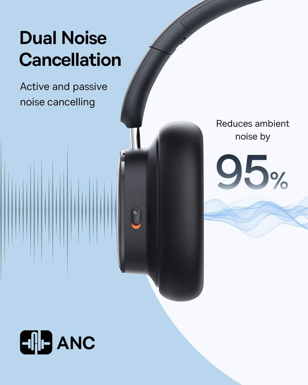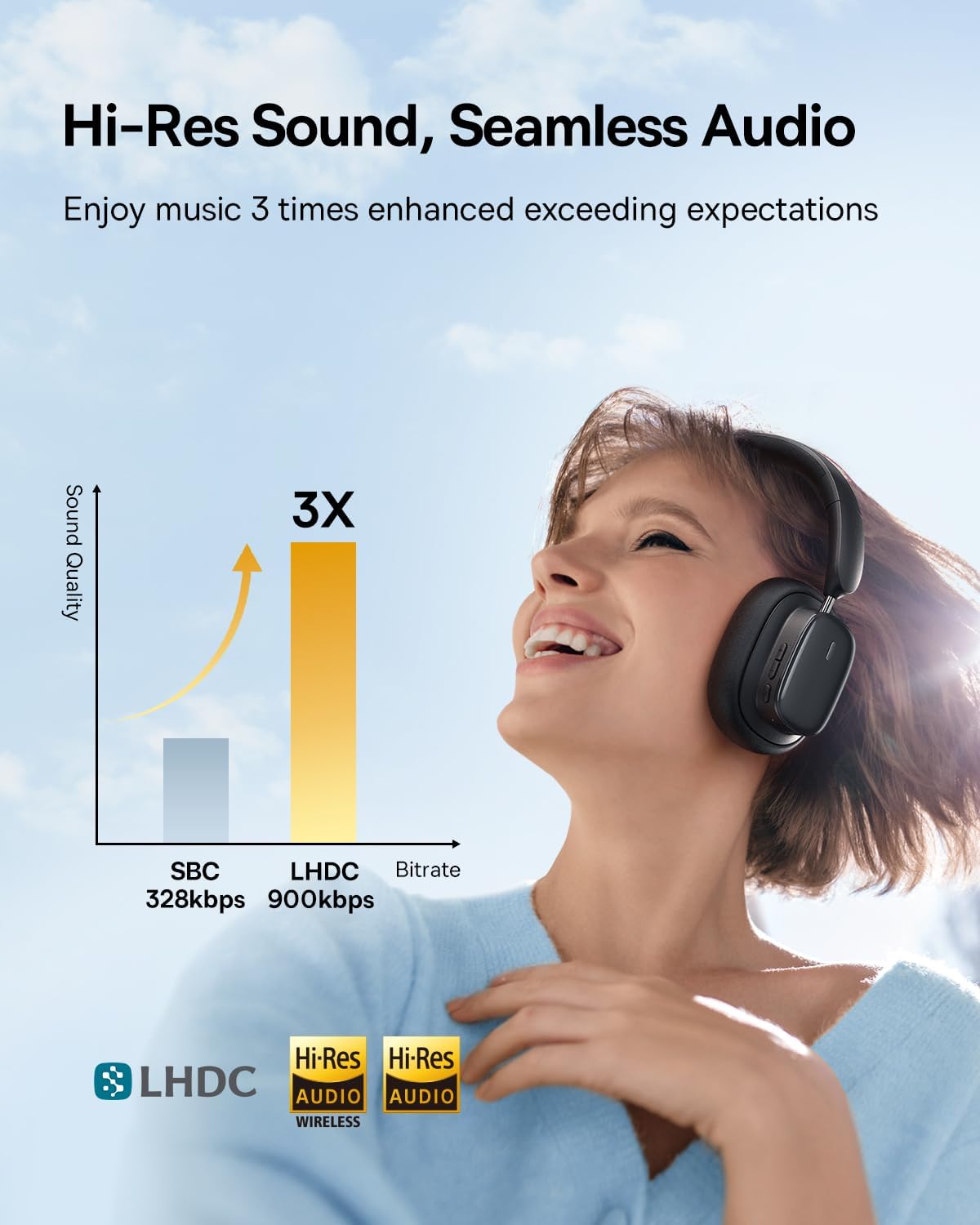 • 𝑯𝒊-𝑹𝒆𝒔 𝑺𝒐𝒖𝒏𝒅, 𝑳𝒐𝒔𝒔𝒍𝒆𝒔𝒔 𝑨𝒖𝒅𝒊𝒐 Certified by Hi-Res (both wired & wireless), Baseus Bowie H1i Noise Cancelling headphones reproduces subtle details heard only in a recording studio, which frequency response can reach up to 40kHz. LHDC codec provides high-resolution audio streaming with low latency, and advanced AI algorithm enhancing bass punch, providing you with audiophile-grade sound quality.