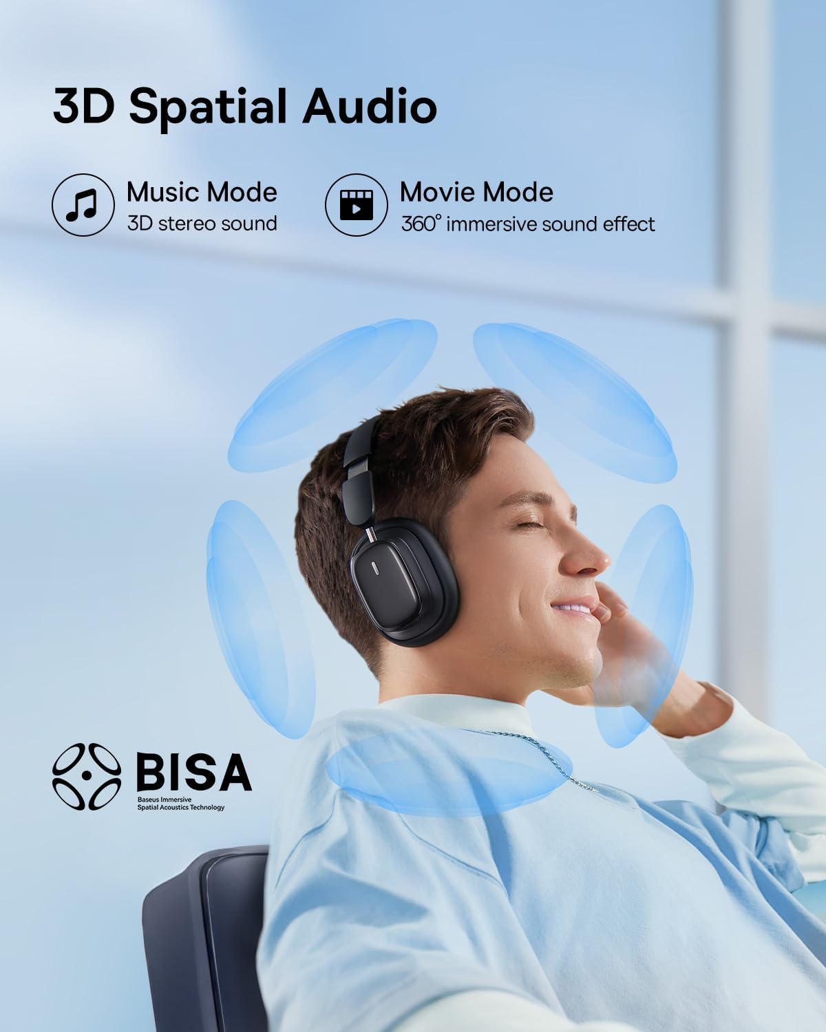 • 𝑰𝒎𝒎𝒆𝒓𝒔𝒊𝒗𝒆 3𝑫 𝑺𝒑𝒂𝒕𝒊𝒂𝒍 𝑨𝒖𝒅𝒊𝒐 With audio algorithm tracking your head’s movements, Baseus Bowie H1i bluetooth headphones keep you always at the center of the sound, creating you a concert-like spatial immersion.
