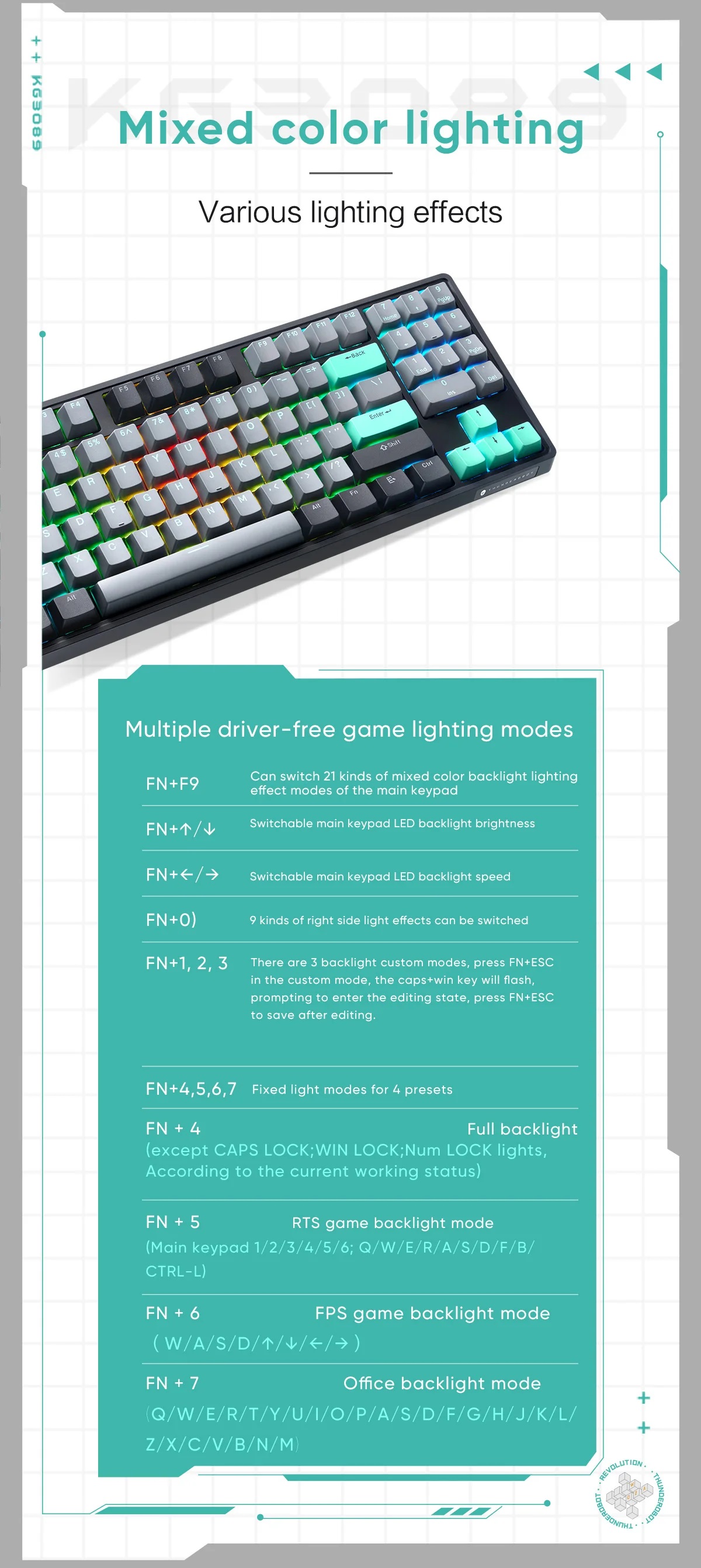 •  Key cap: PBT, 3-color matching, light tight