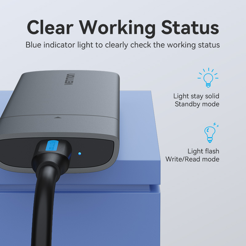 - Clear Working Status: The enclosure features a blue indicator light to clearly indicate the working status, showing a solid light for standby mode and a flashing light for write/read mode.