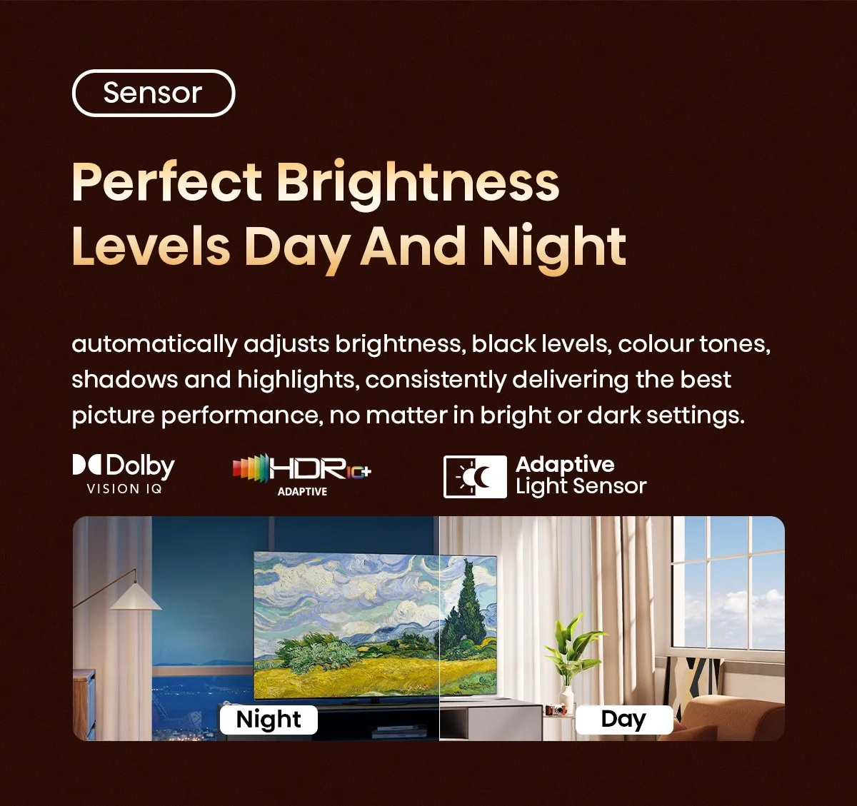 Adaptive Light Sensor, Dolby Vision IQ, HDR 10+ Adaptive In addition to conventional HDR technologies, this TV is also equipped with a light sensor which enables automatic picture adjustment based on ambient lights.