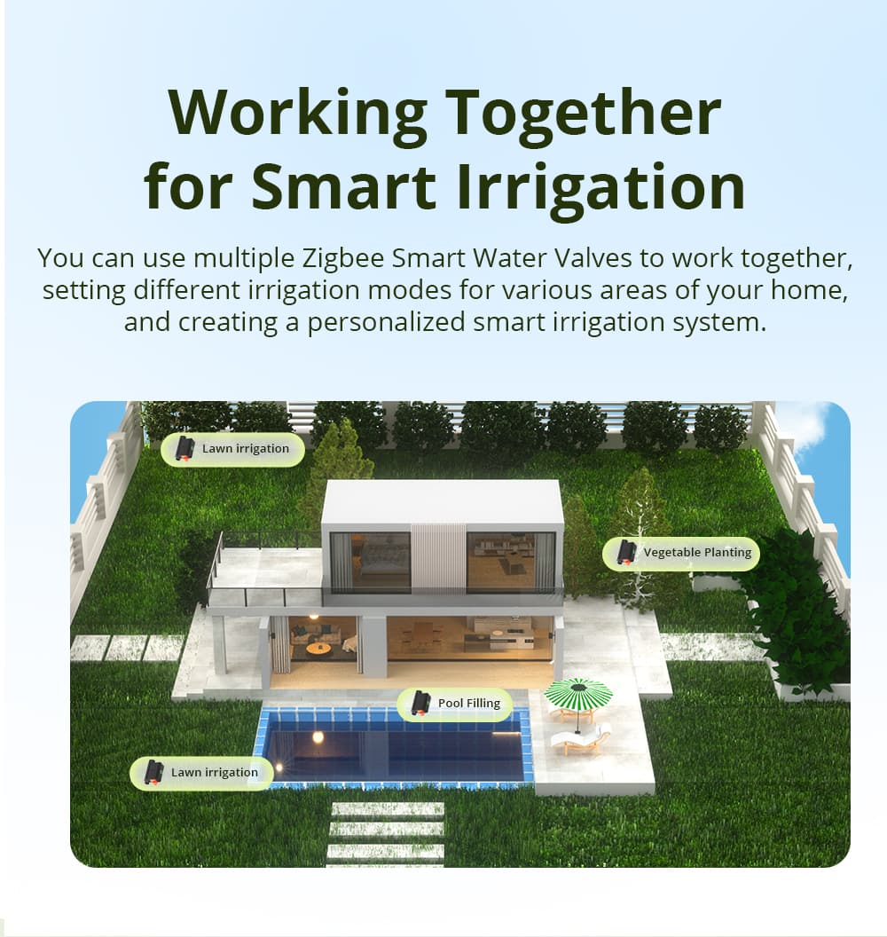 With SONOFF Zigbee Smart Water Valve, you can automate and control your watering system with ease. It is easy and quick to install, simply connect the Zigbee Smart Water Valve between the faucet and the hose to quickly upgrade your irrigation system in just three minutes, automatically watering your lawn, garden, vegetable patch, and more. Open the eWeLink app, tap the button, and you can start today's irrigation immediately. Set a smart scene for the Zigbee Smart Water Valve to irrigate automatically in the early morning, making your life easier.