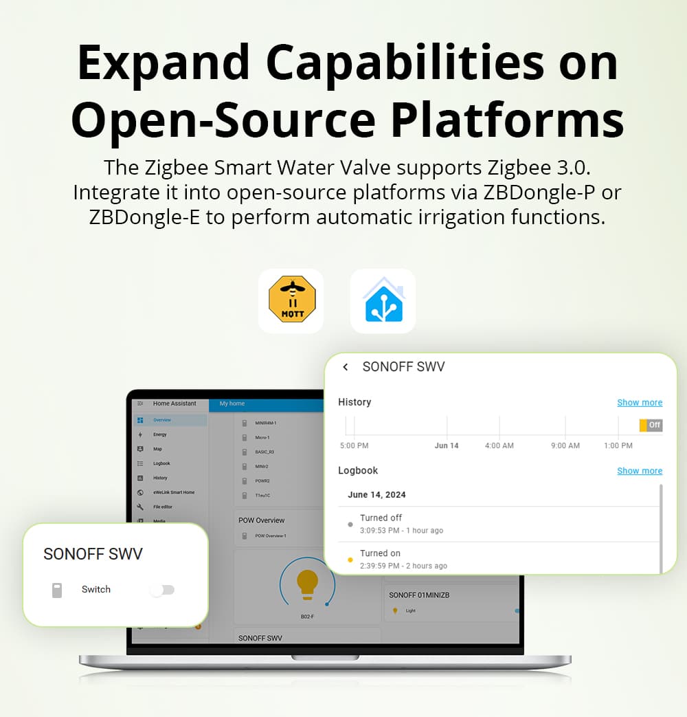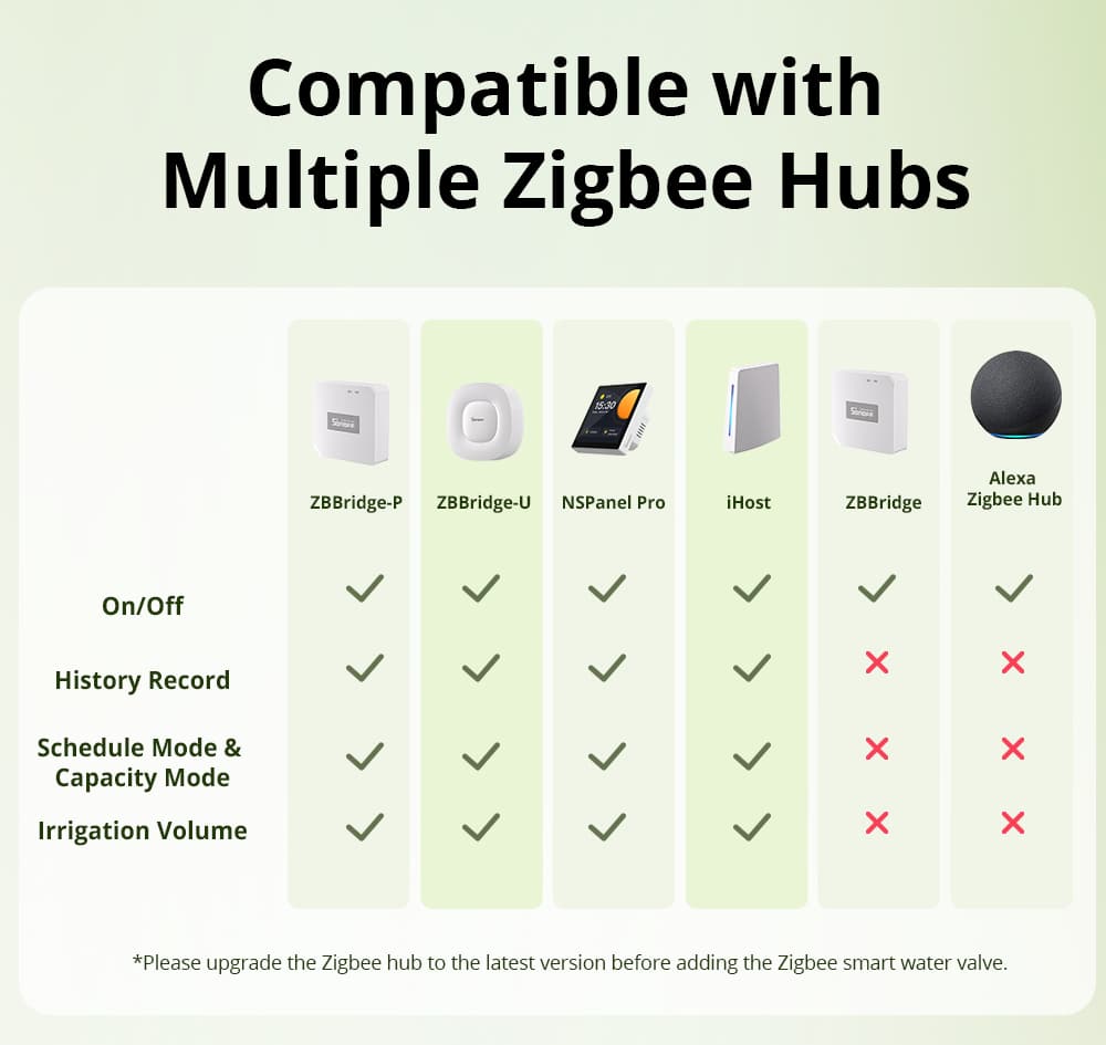 SONOFF Zigbee Smart Water Valve is compatible with Zigbee hubs supporting Zigbee 3.0, including SONOFF iHost, SONOFF NSPanel Pro, ZB Bridge Pro, SONOFF ZB Bridge Ultra, ZBDongle-P, ZBDongle-E, Echo Plus 2nd...