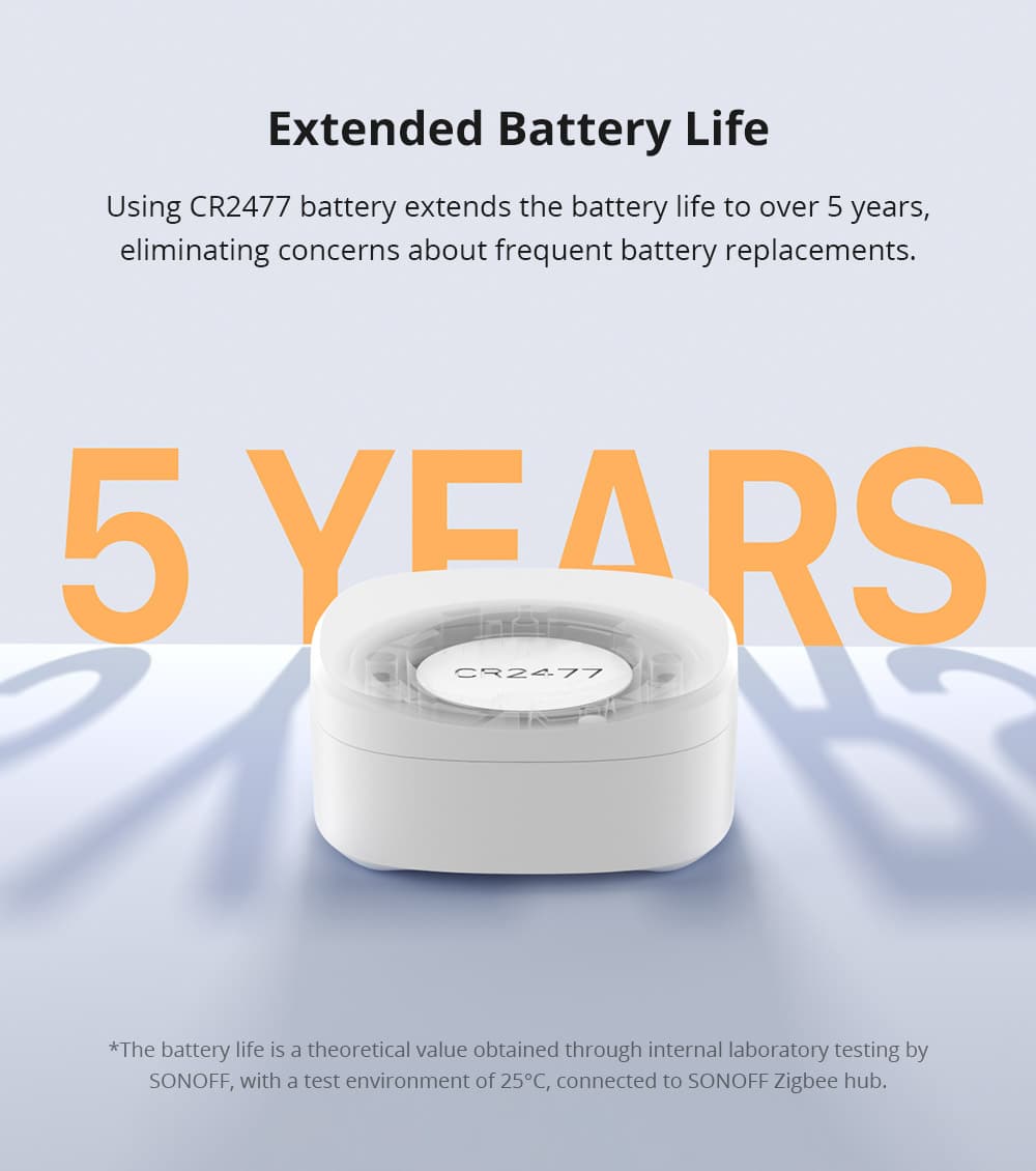 Powered by a CR2477 battery, the SNZB-05P offers over 5 years of use, eliminating concerns about frequent battery replacements. It has an IP67 waterproof and dustproof rating, providing short-term immersion protection and ensuring reliable operation in humid and dusty environments. The sensor is equipped with gold-plated probes for enhanced corrosion resistance and made from UV-resistant materials to prevent discoloration over time.