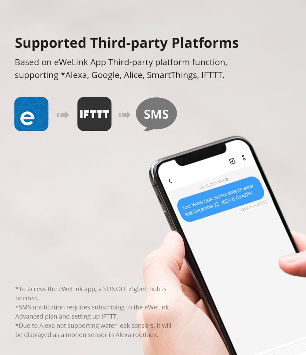 Water damage often goes unnoticed until it's too late. With the SONOFF SNZB-05P, you'll receive app push notifications to your phone when water leakage occurs. Zigbee local scenes can trigger the gateway's sound alarm even if the WiFi network fails. It also supports Email alerts (with eWeLink advanced plan) and SMS notifications (with eWeLink advanced plan, and setting up IFTTT). Multiple notifications allow you to take swift action to prevent costly damage and mold growth. The sensor sends alerts every ten minutes during water leakage events to prevent missed notifications due to network fluctuations, ensuring your property’s safety.