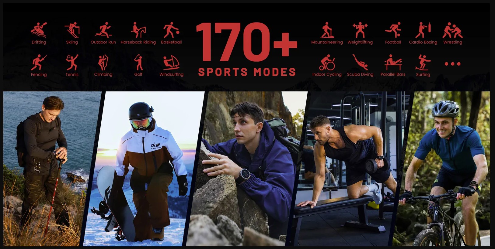 6 Smart Recognition Sport Exclusive smart recognition mode, a collection of walking, running, cycling, elliptical and other six sports, no need to manually, when you exercise automatically recognize your sport and turn on the exercise monitoring. With 170+ built-in sports modes covering various activities like running, cycling, skateboarding, skiing, rock climbing, boxing and more, we provide professional sports monitoring for all your hobbies.