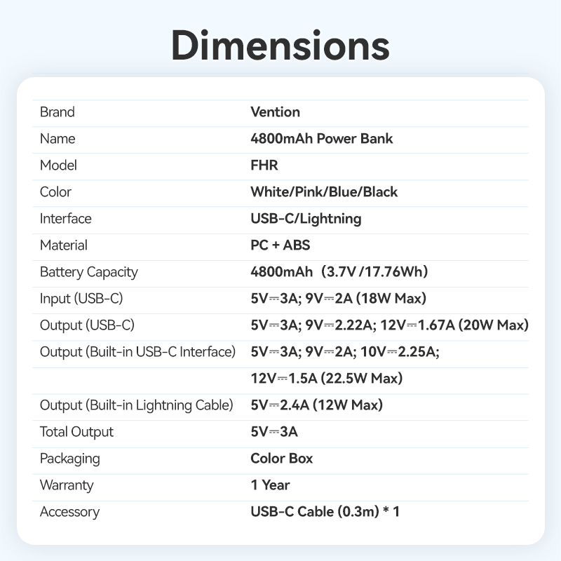 USB-C Output: 5V/3A, 9V/2.22A, 12V/1.67A (Max 22.5W)