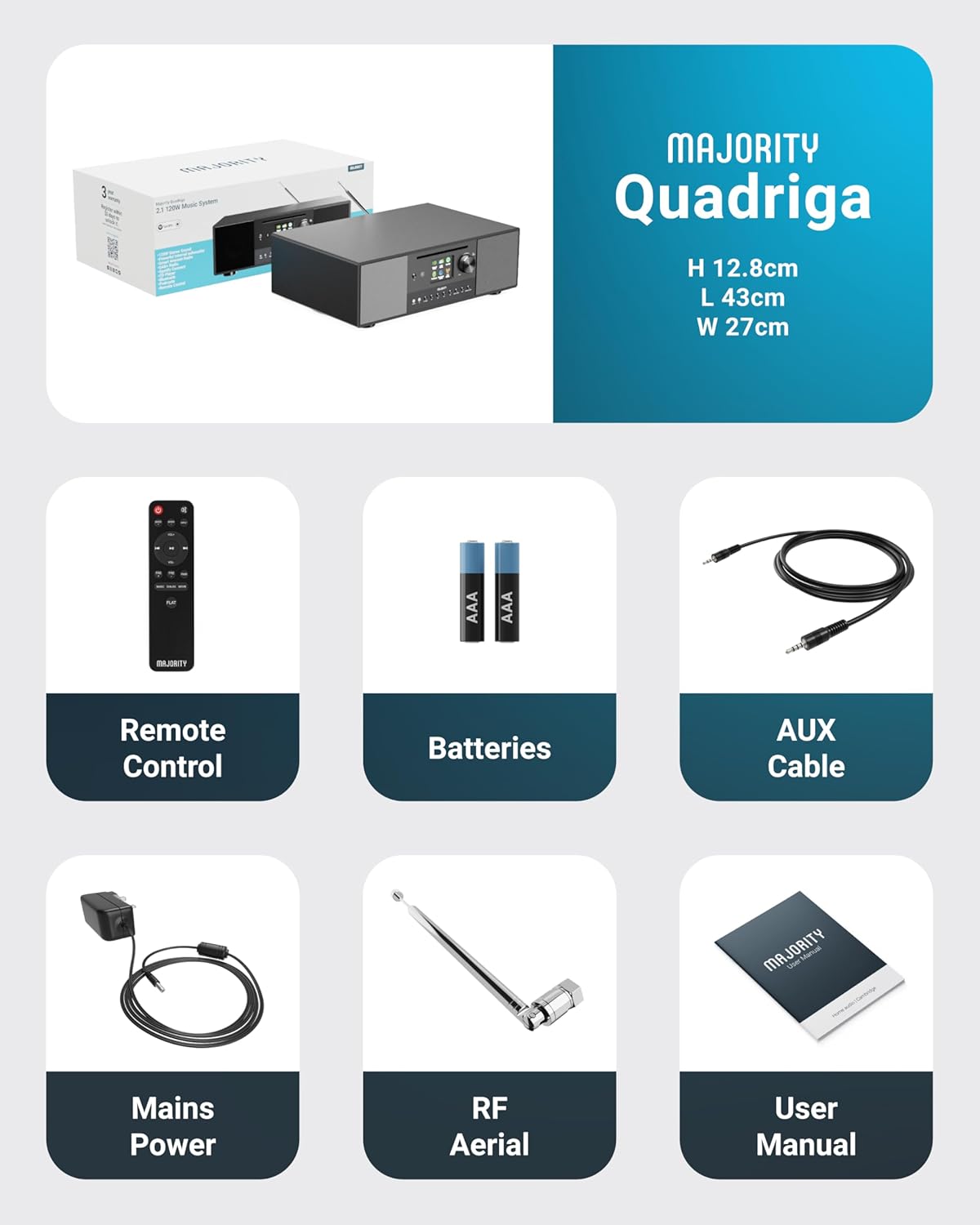 This package contains 1x Majority Quadriga, 1x power cable, 1x remote control, 1x AUX Cable and an easy to read user guide. Dimensions: 27x43x12.8 cm, weight: 5.4kg.