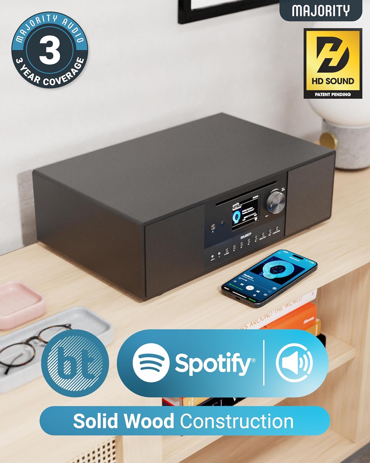 𝗦𝗣𝗢𝗧𝗜𝗙𝗬 𝗖𝗢𝗡𝗡𝗘𝗖𝗧, 𝗣𝗢𝗗𝗖𝗔𝗦𝗧𝗦: Connect your Spotify account to directly stream your music library and favourite podcasts. Inbuilt CD player also allows to enjoy your older music catalogue in exceptional Hi-Res quality.