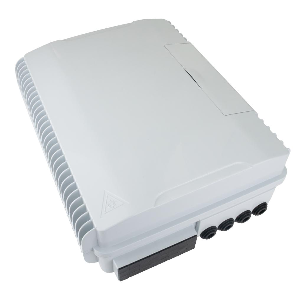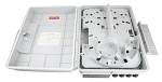 The Opton FDB-0424G-E is a fiber optic splice closure equipped with 4 entries for backbone cables and 24 outputs for client cables. The diameter of the linear holes is 9 mm, while the output size is 2 x 3 – 5 mm. The product is made of ABS plastic and polycarbonate, fully adapted for outdoor use, and features an IP65 protection rating. Inside, there is a mounting frame that allows the installation of up to 24 SC Simplex adapters or 48 LC Duplex adapters. Beneath the large tray, on the opposite side of the frame, there are 24 slots for splice protectors. Additionally, there is a separate tray inside the closure for 12 splices. The closure stands out due to its large size, with dimensions of 34 x 26 x 10.5 cm, and features three dedicated areas for cable slack management. The product is designed for wall mounting, and the set includes mounting plugs.