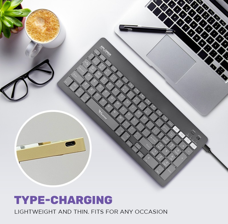 Dual Connection: Bluetooth | Wireless 2.4G | Built-in Retractable Device Stand | Type and Switch Functionality | Plug and Play | Type-C Charging | 79 Unique Round Design Soft and Silent Keypads | UV Coated Keypads for Durability