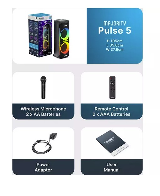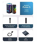 The mighty Pulse 5 Party Speaker delivers 600W of thunderous sound with dual 12 drivers, Bluetooth, TWS pairing, AI lights, and 8-hour battery life. Includes a wireless microphone with two extra mic ports, a 6.5mm guitar jack, USB/AUX/SD playback, and a remote control – your ultimate portable party machine.