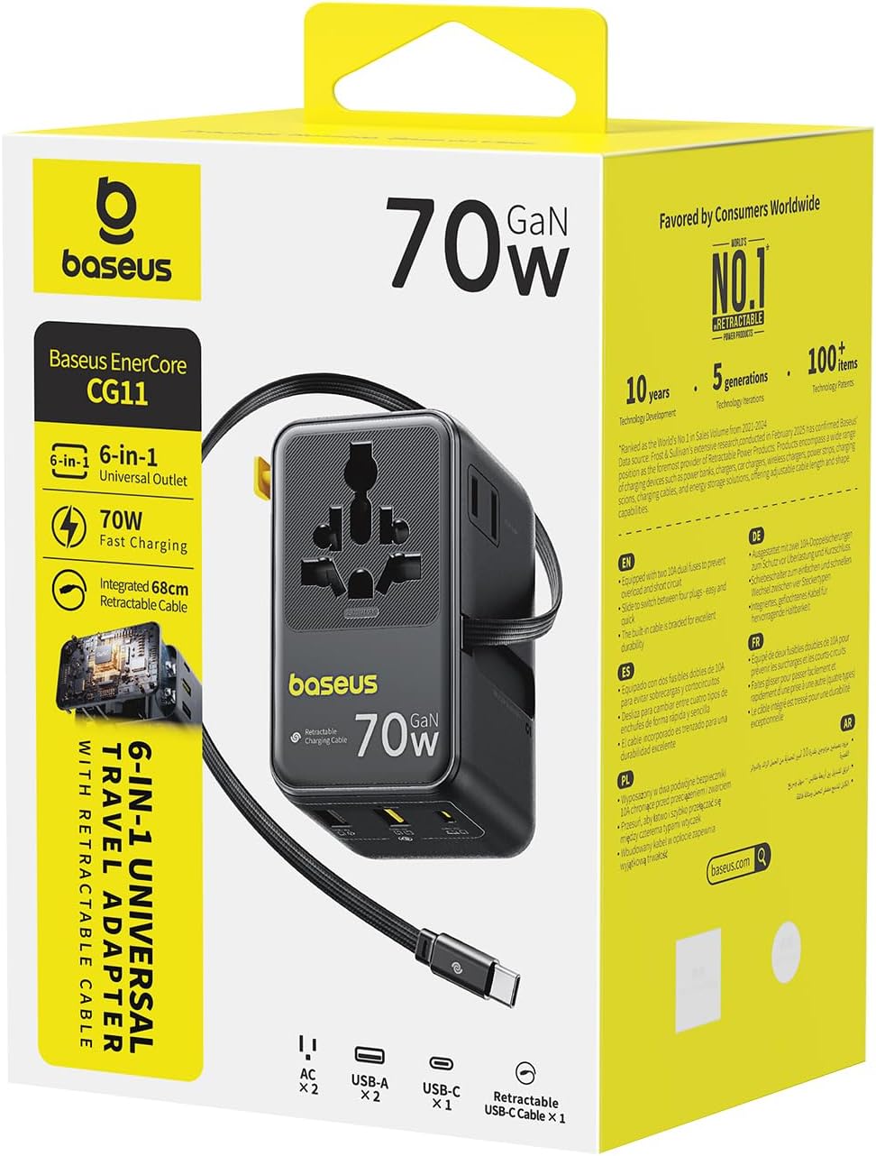 Bult-in 70W USB-C Retractable Cable - Baseus international plug adapter can deliver up to 70W Max. with the built-in retractable USB-C cable, that was braided with nylon to withstand wear and tear in daily use. Just pull to charge anywhere, anytime, no need to carry extra cables.