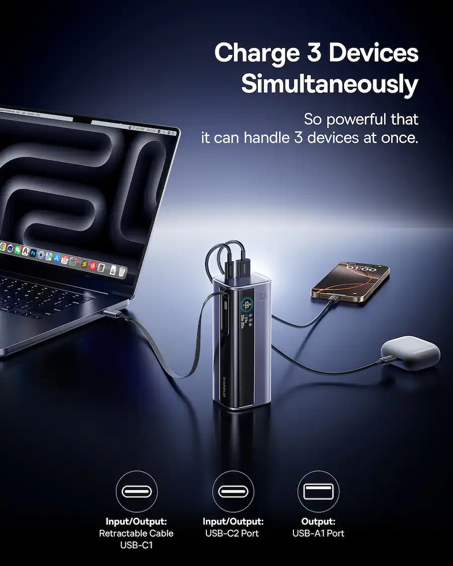 60CM RETRACTABLE CABLE Baseus EnerGeek power bank has a built-in 60cm retractable charging cable. Baseus developed retract cable is particularly durable and easy to store - no more tangled cables on your desk or in your luggage.