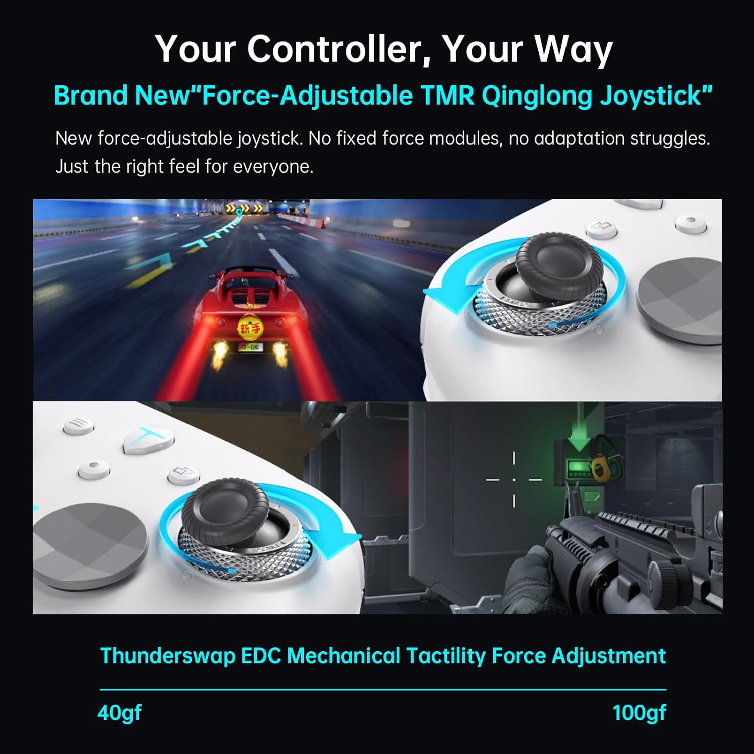 Precision TMR Joysticks with Force Adjustment Equipped with custom TMR joysticks and a mechanical resistance dial, this controller lets you manually fine-tune joystick tension to match your exact playstyle. Whether you prefer loose control for smooth racing or tighter resistance for precision aiming, enjoy a personalized, pro-level experience that elevates every move.