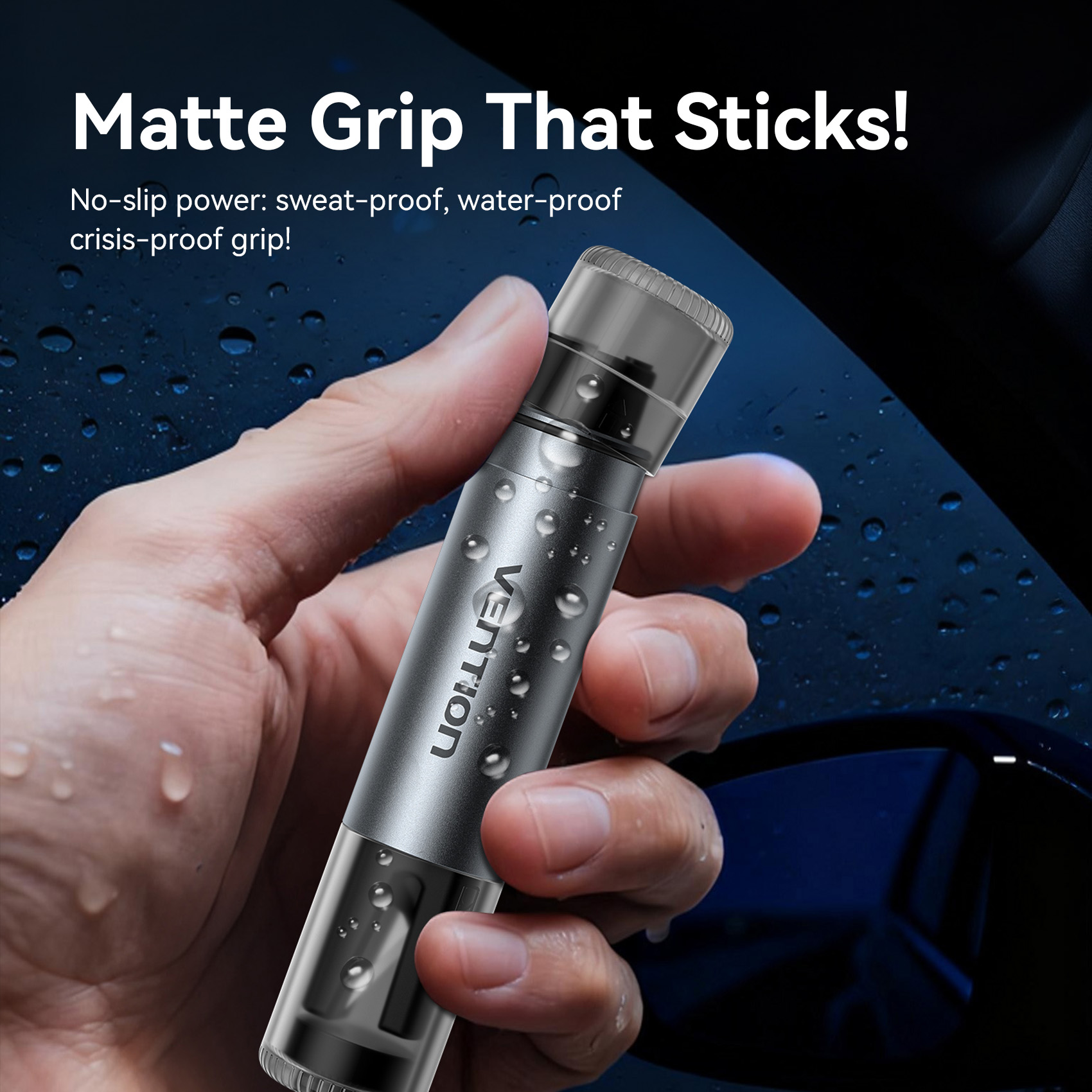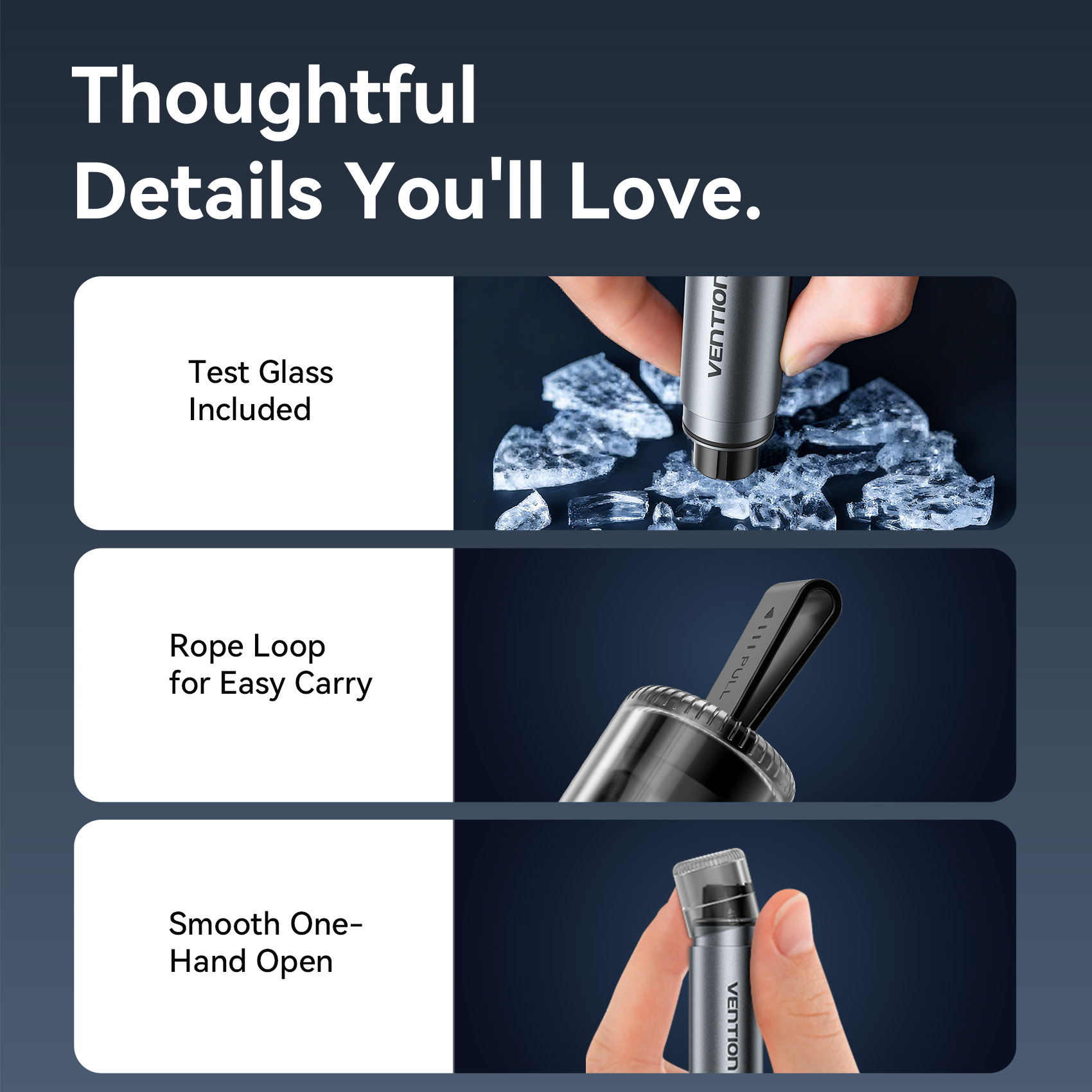 The Vention KRUH0 is a compact, gun-style spring-loaded emergency tool designed for rapid vehicle escape. Unlike traditional heavy hammers that require a large swinging motion, this uses a high-pressure internal spring to shatter glass with a simple press.