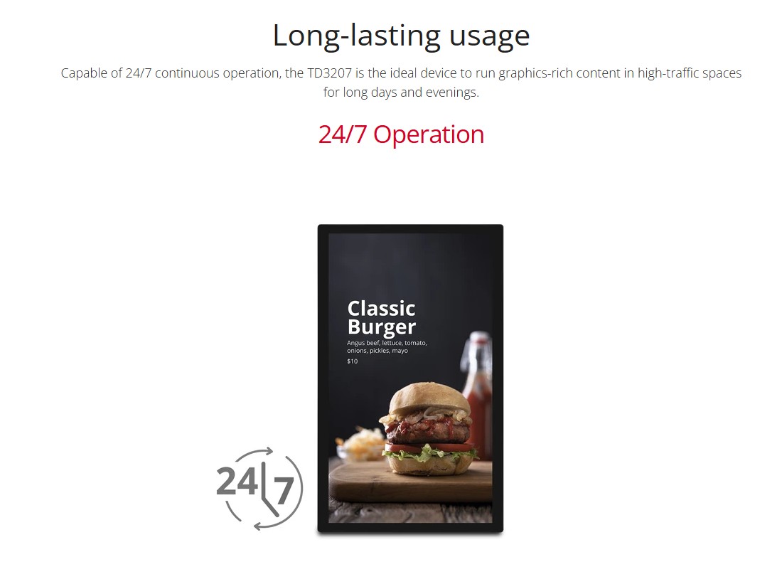 The ViewSonic's TD3207 is the ideal solution for commercial and industrial spaces. Designed for heavy, continuous usage, the open frame series TD3207 delivers a 24/7 long-life. Resistant to moisture and scratches, the 3mm thick glass screen features an intuitive 10-point PCAP touch technology for maximum interactivity. Featuring SuperClear® AMVA panel technology, the device delivers lifelike imagery, vivid color, and constant brightness of up to 450 nits. Connection options include HDMI and DisplayPort inputs for effortless sharing capabilities and an RS232 allows you to control the device remotely. Equipped with VESA mounting design for any surface and screen orientation, the touch screen is the perfect display for various environments.