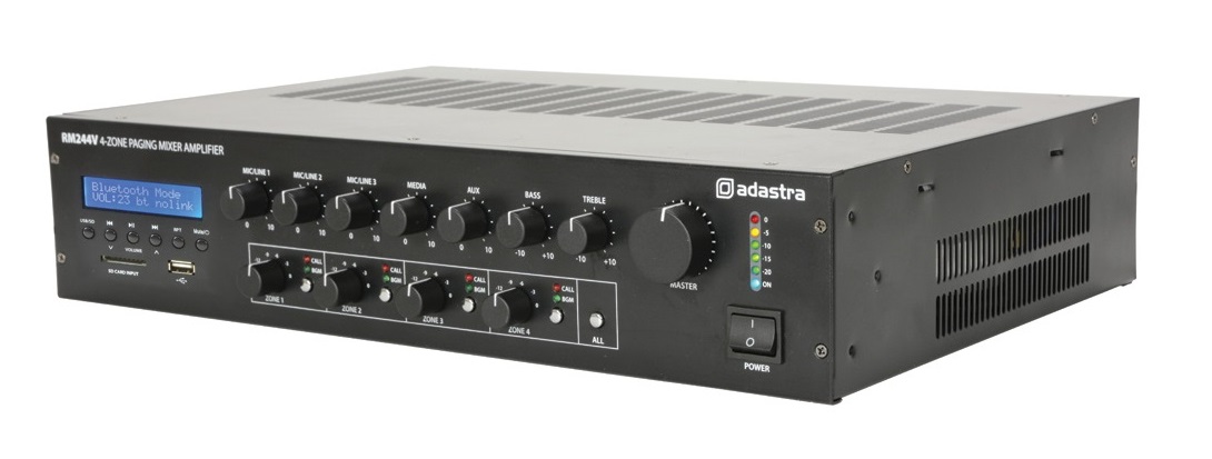 240W mixer-amplifier with 3 mic/line inputs, 1 aux input and a built-in media player. Connections for mic/line inputs are jack or XLR and channel 1 input has a variable mute for priority override. 24V contacts can be connected to a fire alarm panel for emergency evacuation if required. The media section can provide playback from Bluetooth, USB/SD media or an FM tuner. Output terminals are provided for 4 zones which share the output of the 240W amplifier, governed by 4 individual rotary volume switches on the front panel. RJ45 inputs on the rear panel allow connection for up to two CS4 call stations to enable paging to individual or all zones. The RM244V offers versatile 4-zone control without the expense of a quad amplifier and can even be operated as the front end to an expanded public address system.